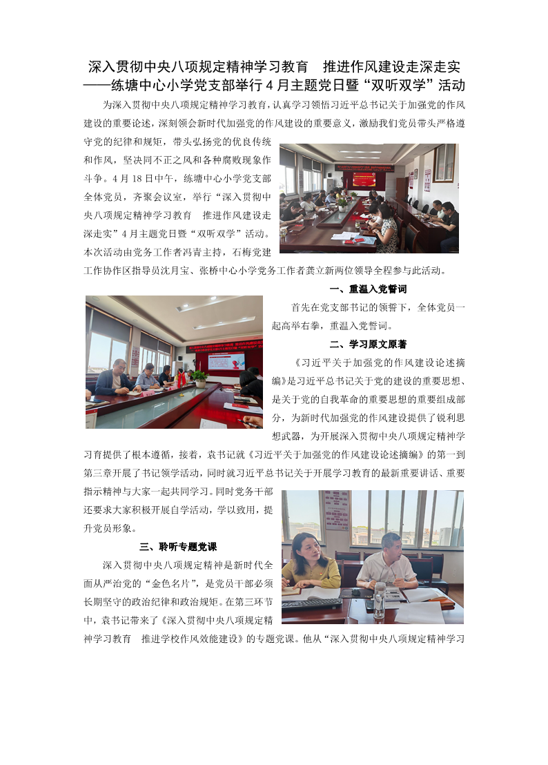 深入贯彻中央八项规定精神学习教育 推进作风建设走深走实——练塘中心小学党支部举行4月主题党日暨“双听双学”活动 来源: 发布时间:2025-06-24 11:15:04 浏览次数: 次 【字体:小 大】 分享到: 【打印正文】