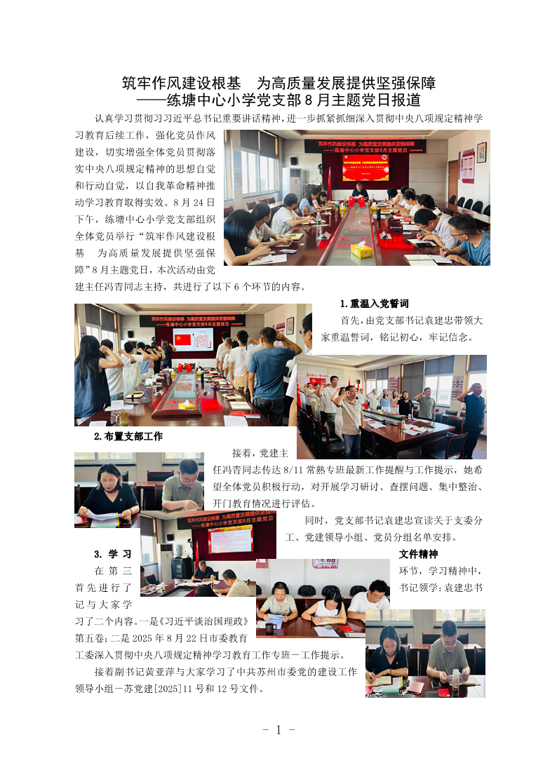 筑牢作风建设根基 为高质量发展提供坚强保障——练塘中心小学党支部8月主题党日