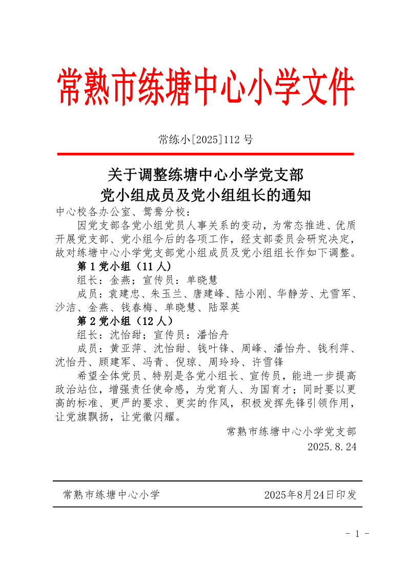 调整练塘中心小学党支部党小组成员及党小组组长的安排