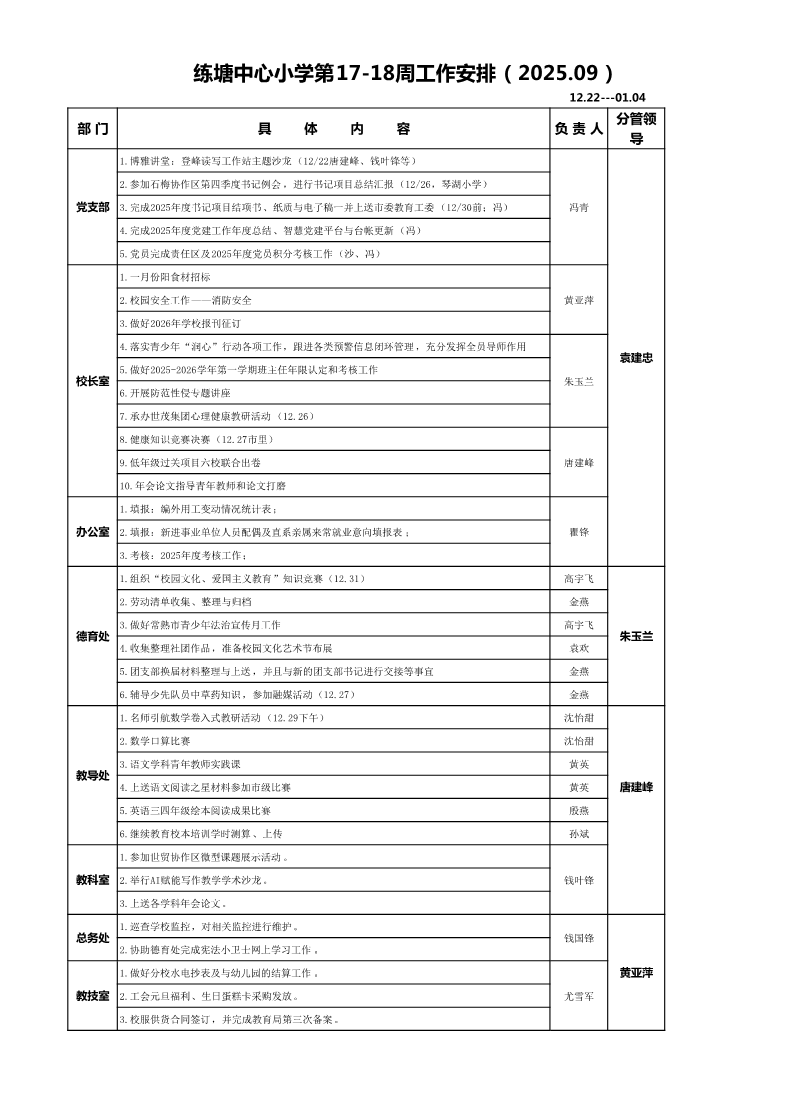 练塘中心小学2025秋季学期两周工作安排表(第17-18周)