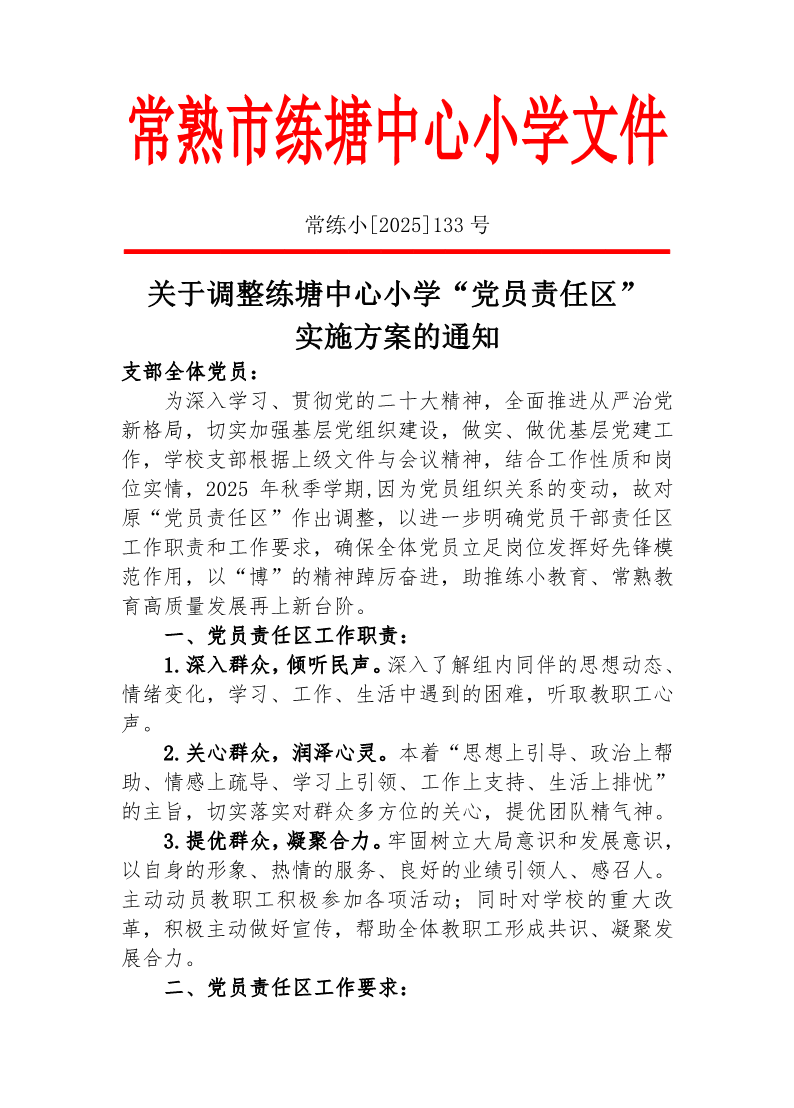 关于调整练塘中心小学“党员责任区”实施方案的通知