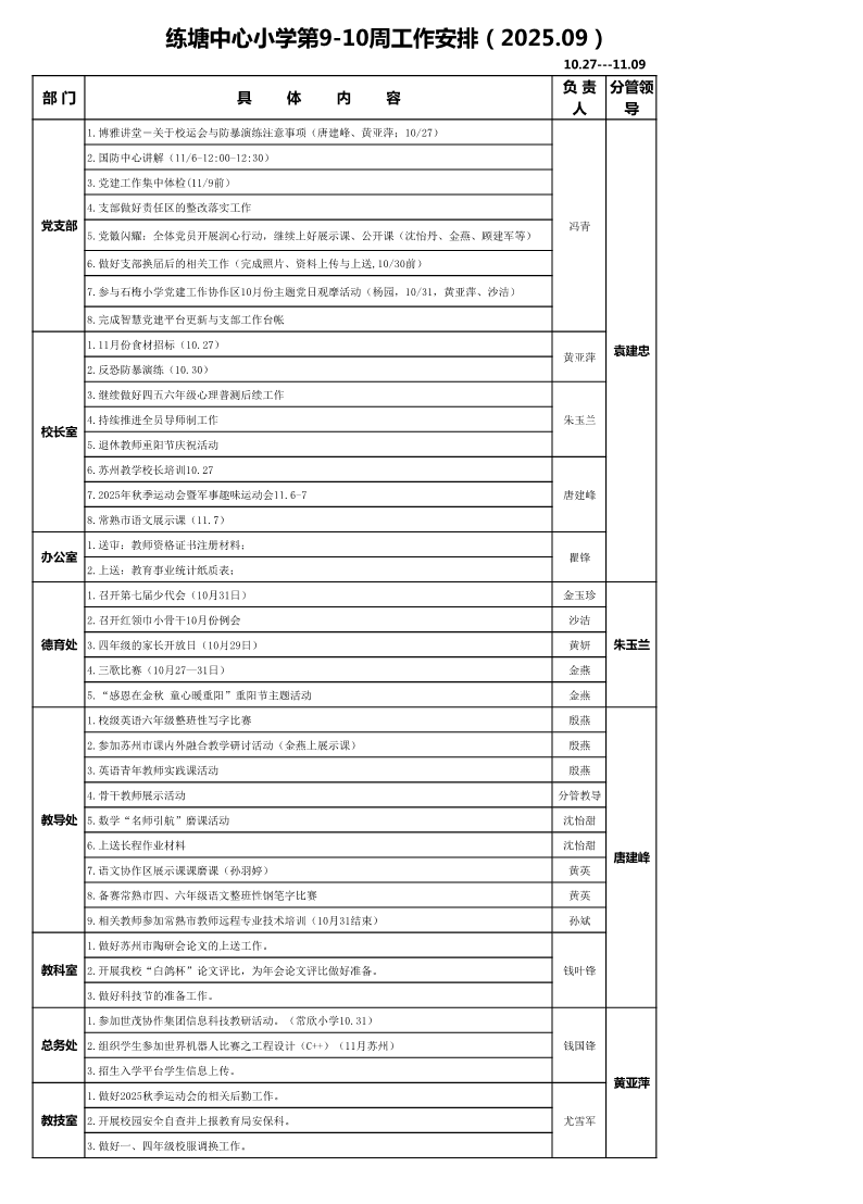 练塘中心小学2025秋季学期两周工作安排表(第9-10周)