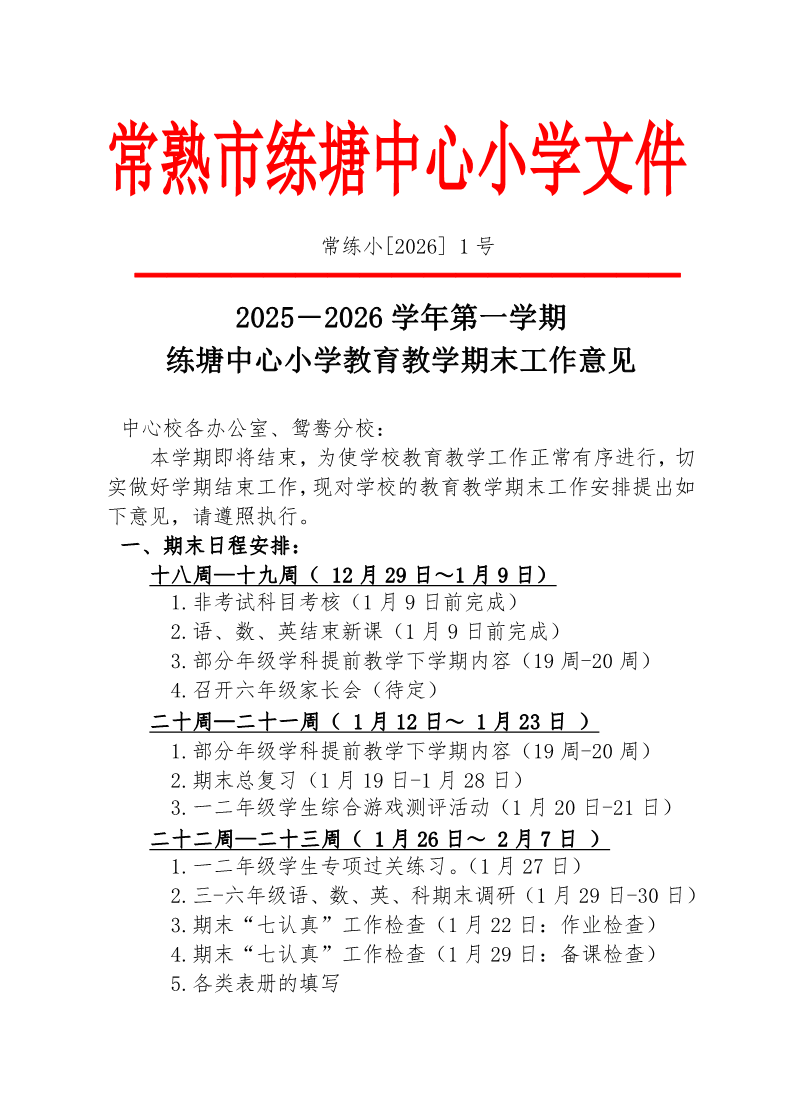 2025―2026学年第一学期练塘中心小学教育教学期末工作意见